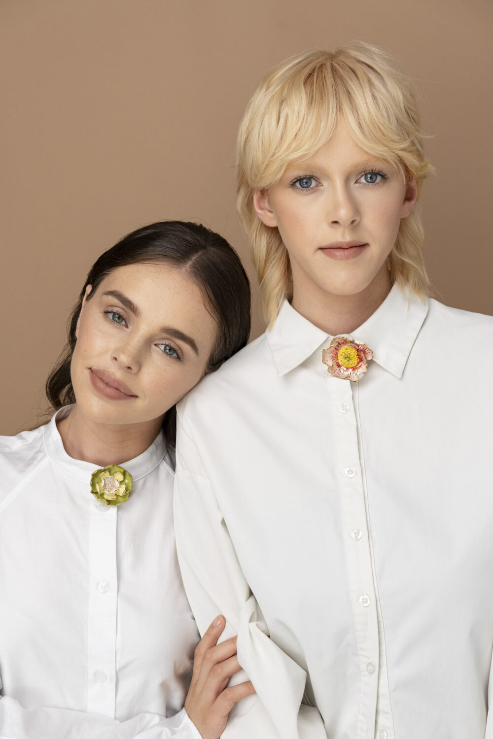 Hand-painted floral porcelain brooch, a unique piece created in our atelier. Carefully shaped and detailed with 24-karat gold, this elegant brooch captures the delicacy of nature in a timeless accessory, perfect for refined and feminine outfits.