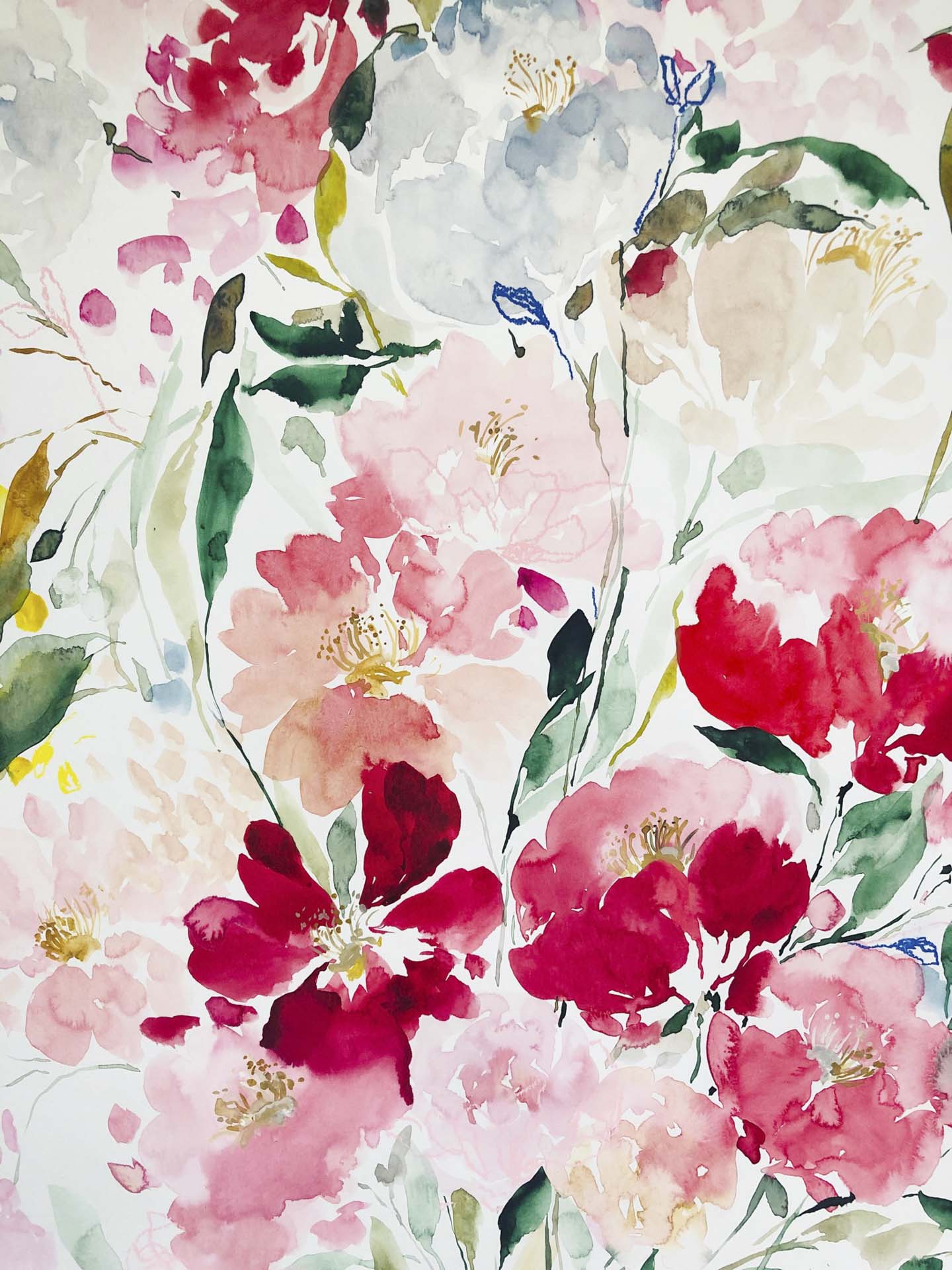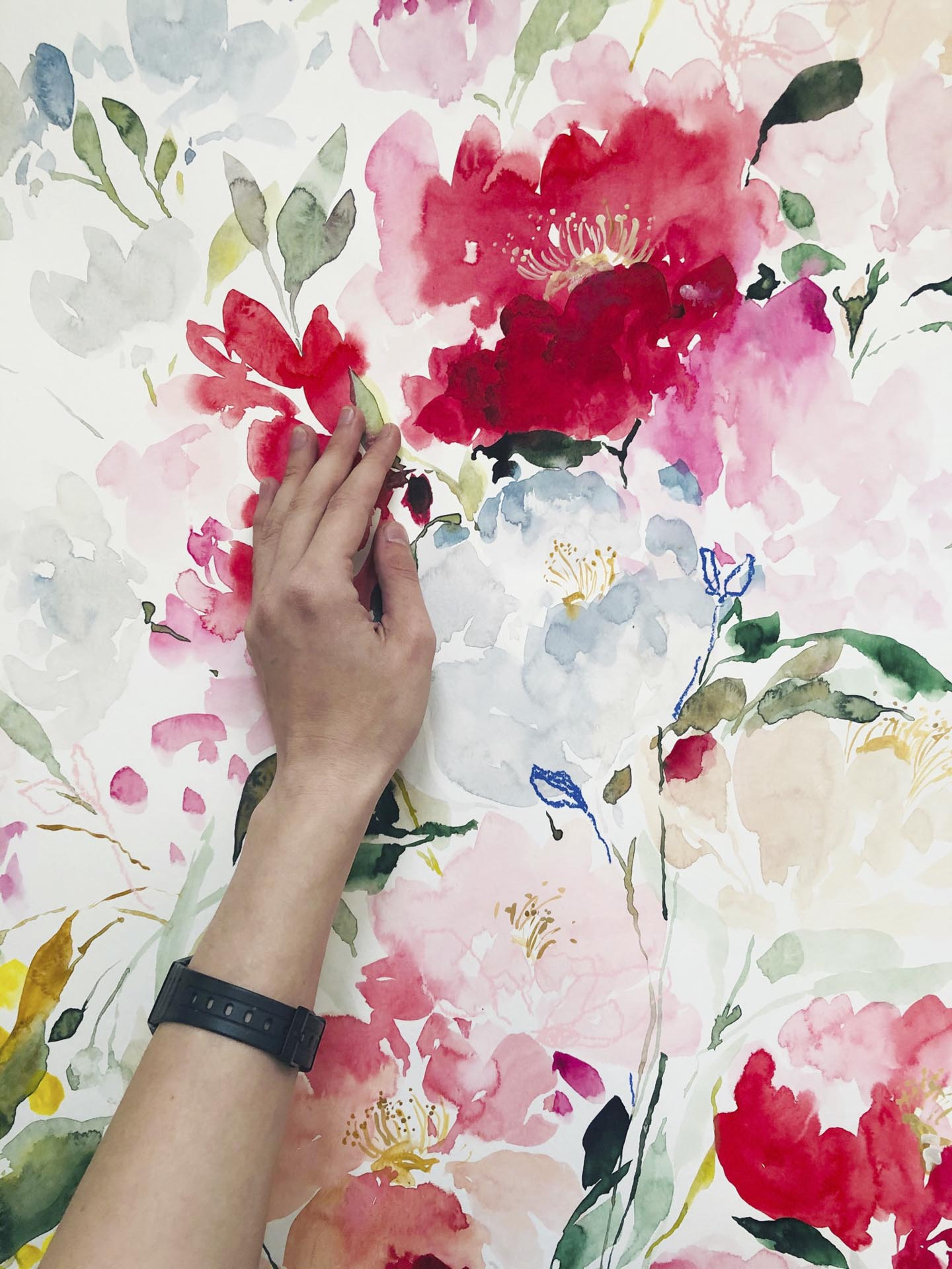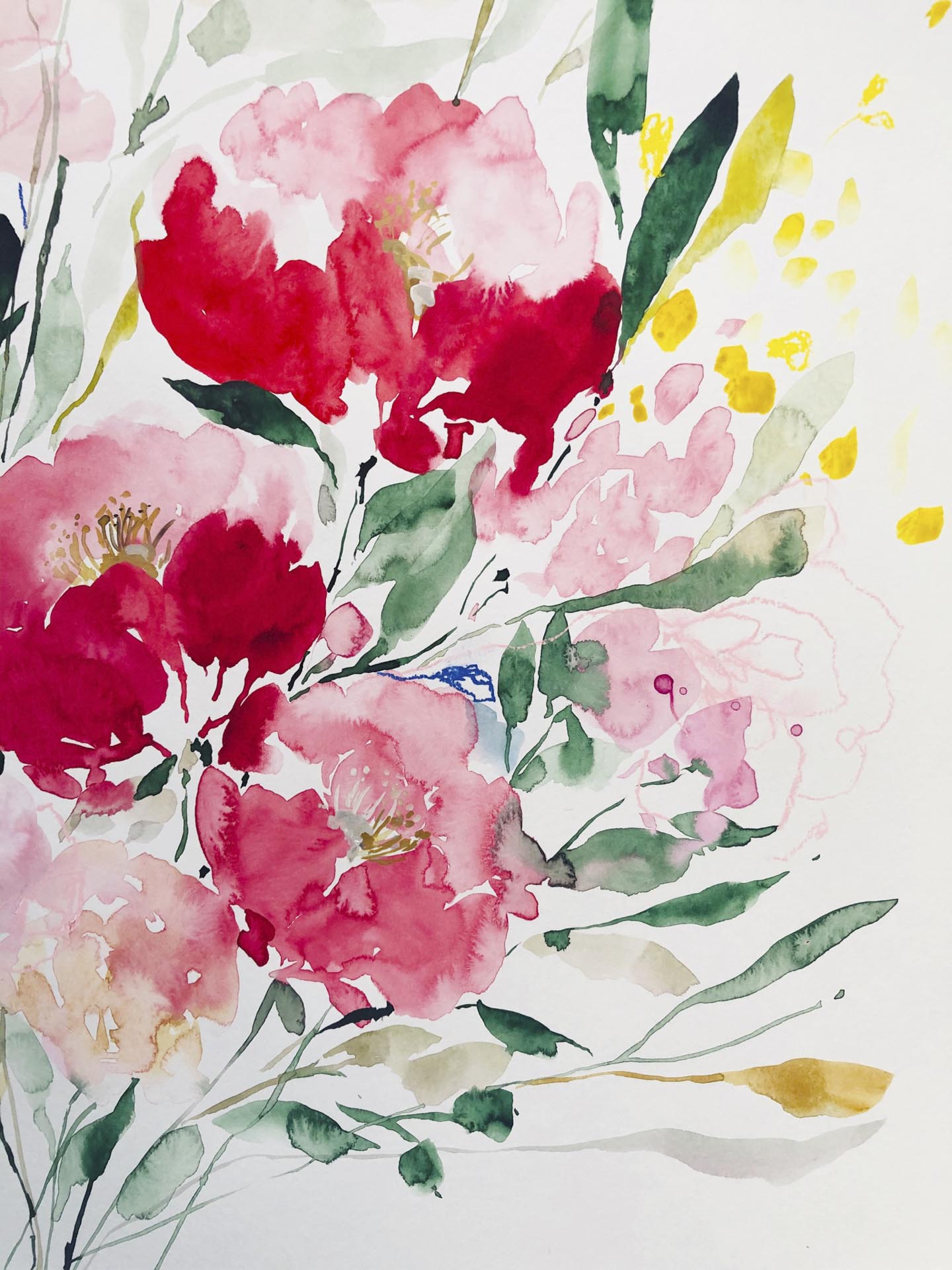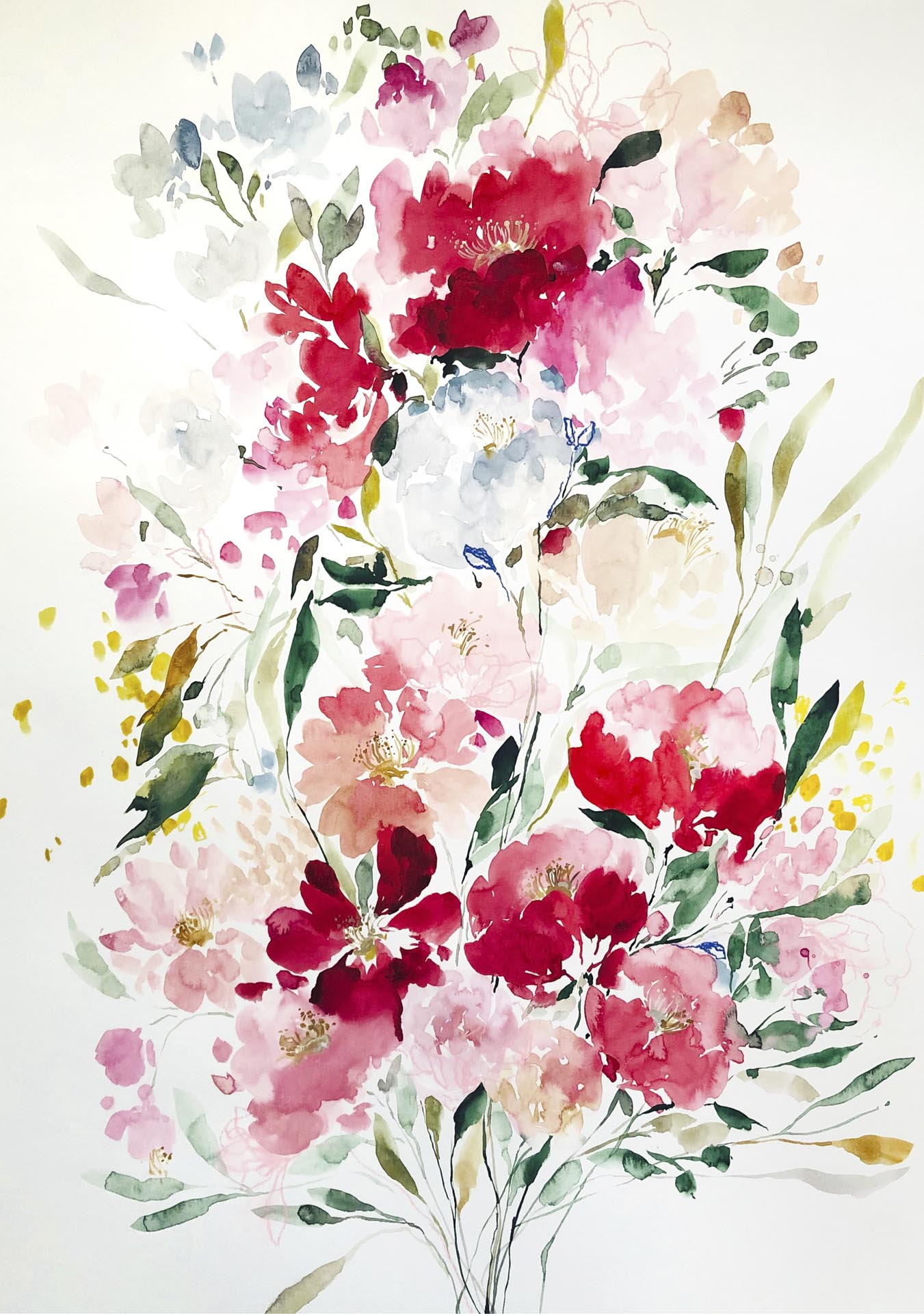 Tantalizing red flowers are spreading around this large artwork, filling our sight with beauty. The blooms are free, gestural and untamed. The process was this way also – painting felt like dancing on this big paper. Size: 70 x 100 cm