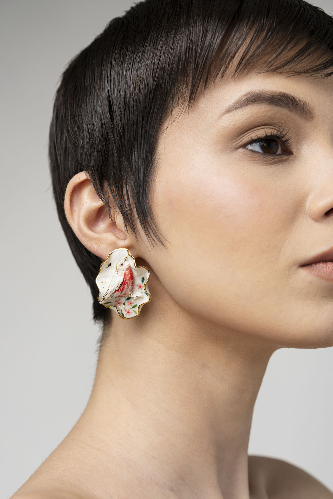 The Mother Nature Collection celebrates the delicate beauty of nature through entirely handcrafted porcelain jewelry. Each creation is carefully shaped and hand-painted, highlighting the elegance of floral motifs, harmoniously complemented by nature-inspired details such as butterflies, ladybugs, birds, and fruits.