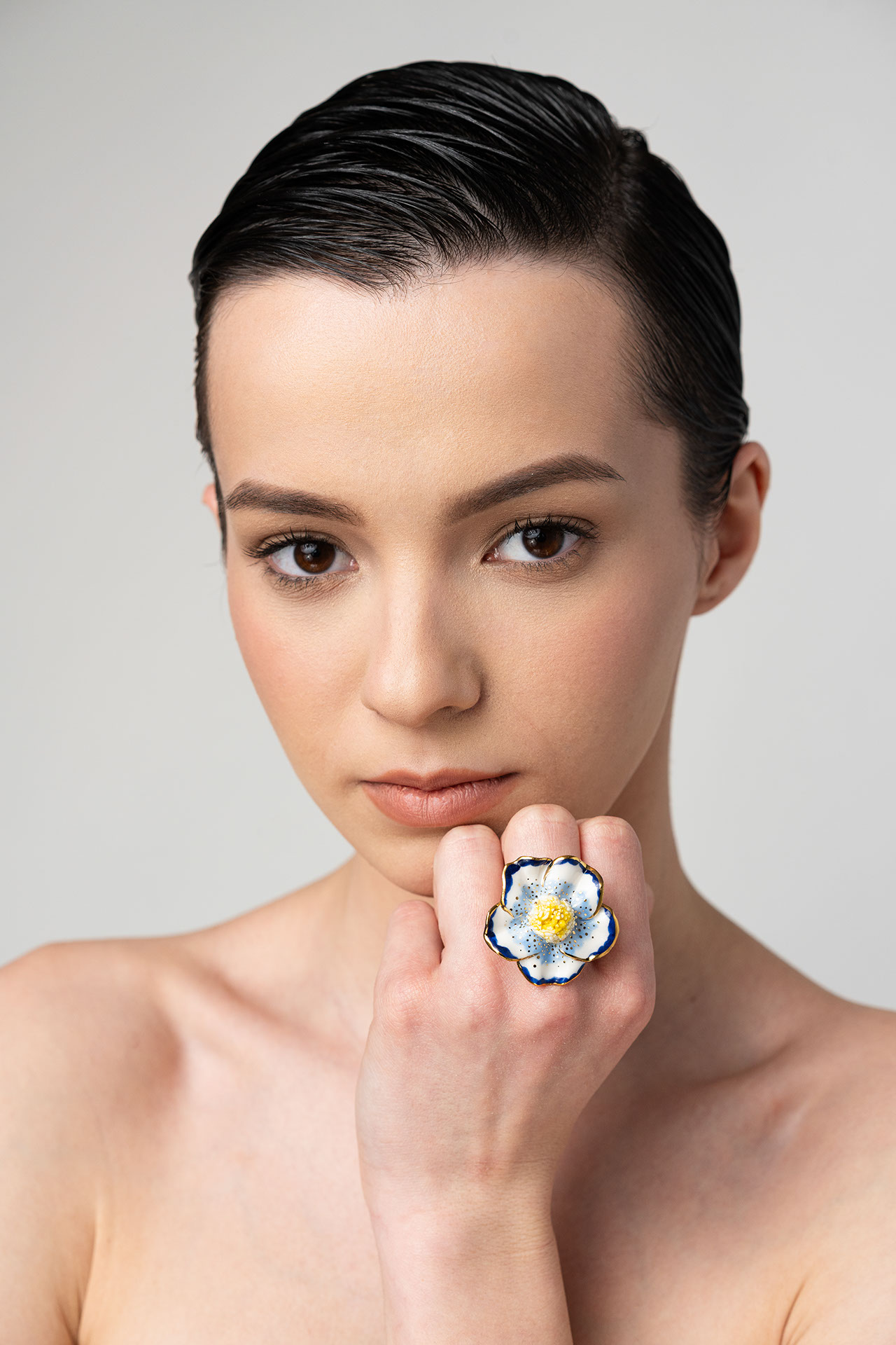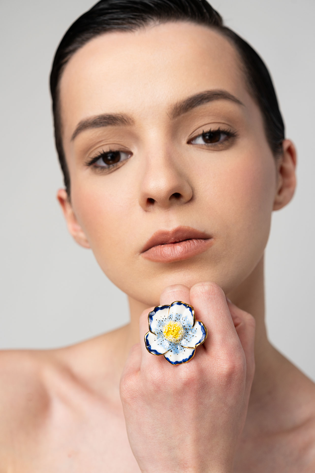 - The base of the ring is adjustable, made of gold-plated sterling silver.