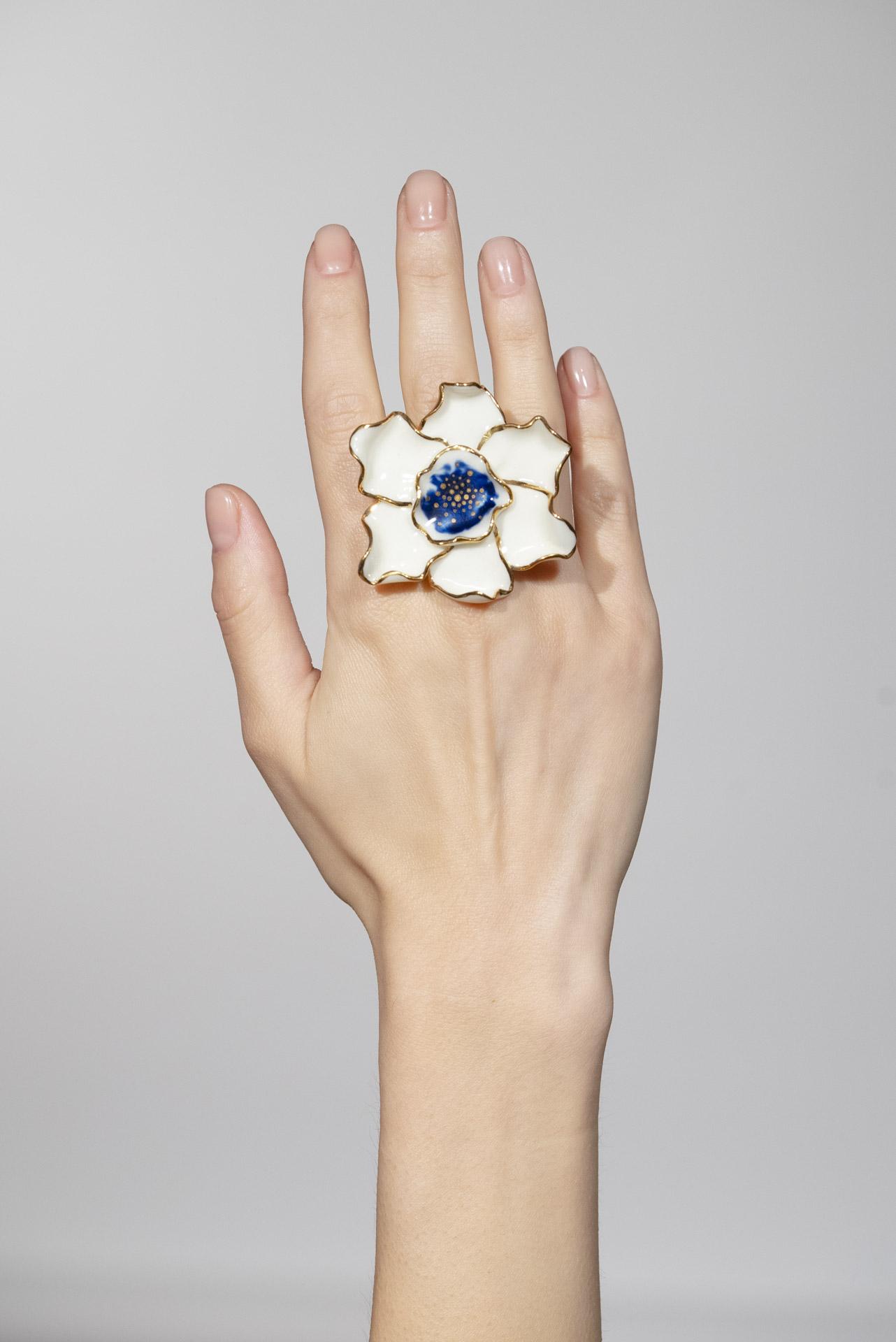 The Flower of Paradise Ring is a one-of-a-kind handmade piece of jewelry as a slice of art, a handcrafted piece of jewelry that embraces the consummate character of a contemporary design piece. One of the most beautiful large flower rings you’ve ever seen and, why not, one that will ennoble the finger you choose to wear it on. A depth of detail, hand-painted with 24k ceramic gold, painstakingly and leisurely, a creative process spanning over a month, all pay homage to the exclusive rings made by Romanian designers.