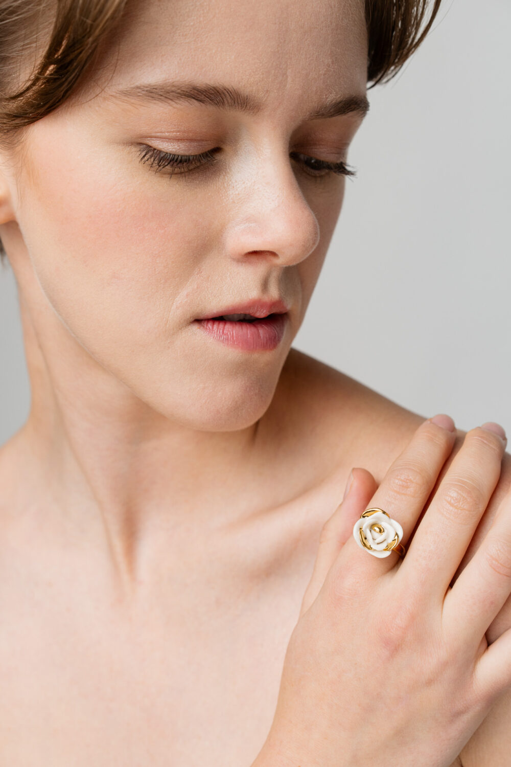 - The ring base is adjustable, made of gold-plated sterling silver.