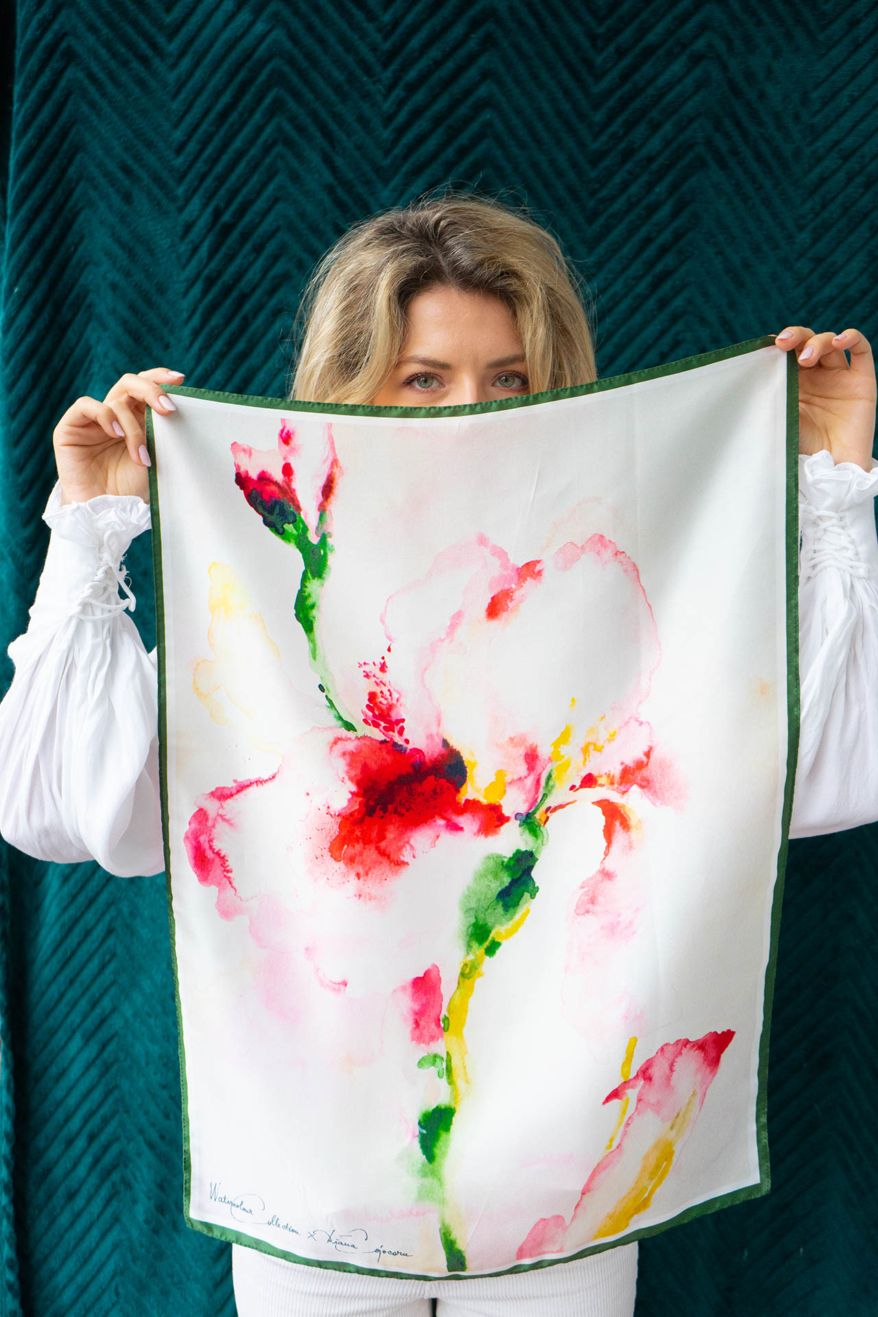 Each scarf bears the artist’s distinctive signature.