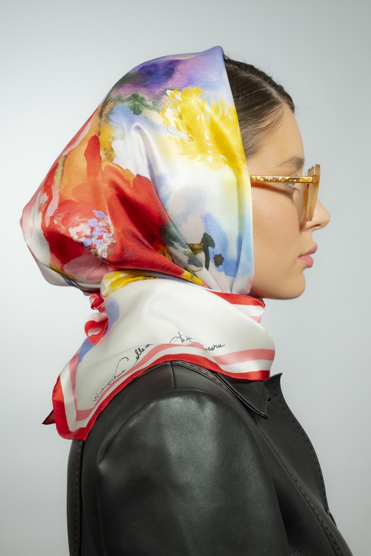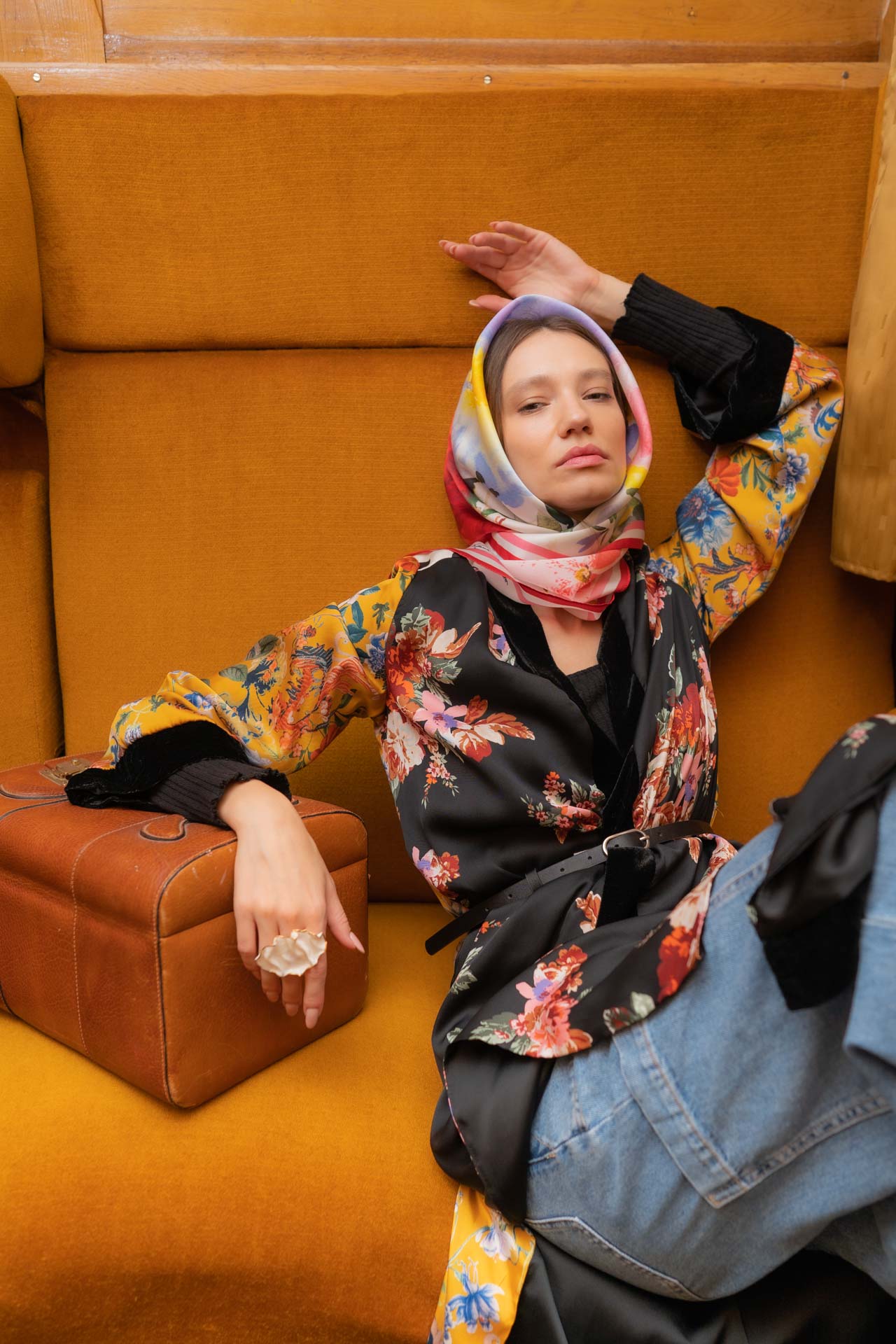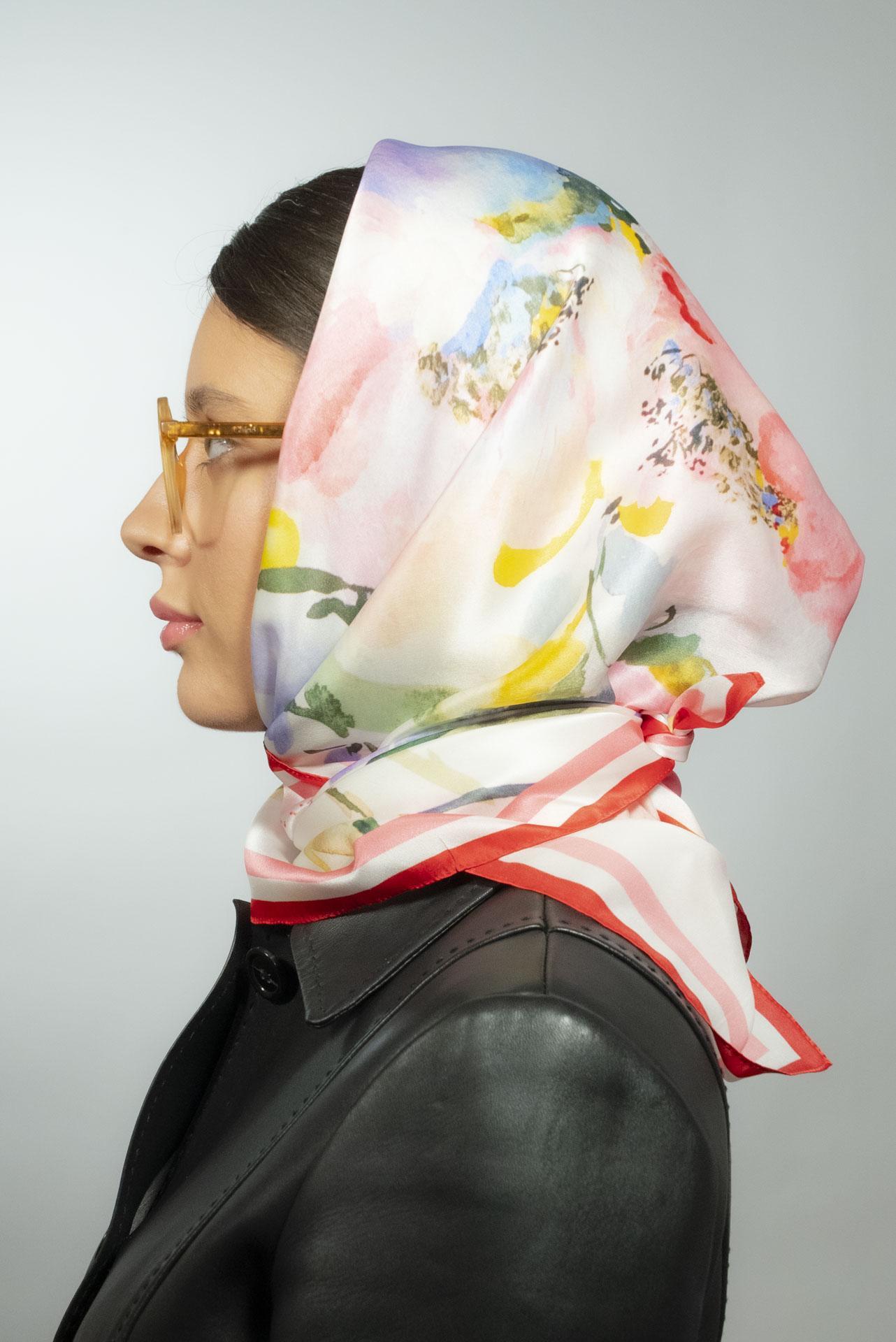 Keep the scarf in a cool, dry place. Use the iron with a textile layer on top on minimum mode. Chemical clean to preserve the beauty of your scarf for longer. Avoid directly spraying perfume or other chemicals.