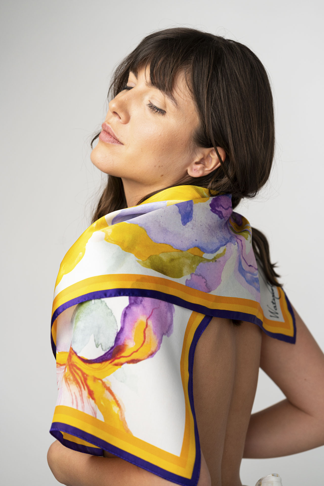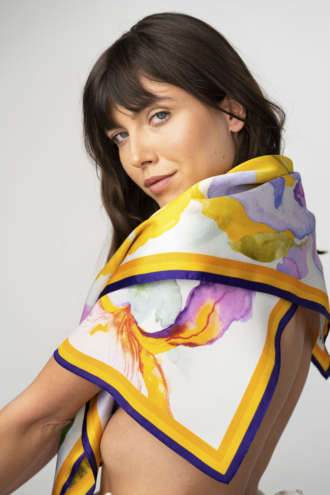 Keep the scarf in a cool, dry place. Use the iron with a textile layer on top on minimum mode. Chemical clean to preserve the beauty of your scarf for longer. Avoid directly spraying perfume or other chemicals.
